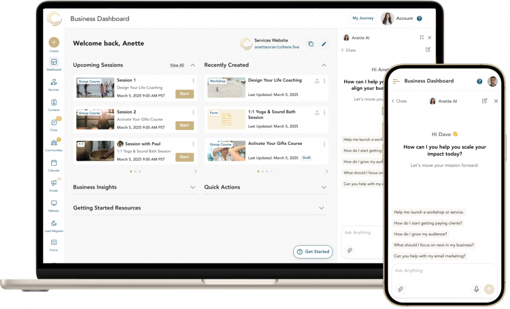 Cohere’s AI is designed for heart-led coaches and healers. It reduces busywork, strengthens your clarity, and helps you express your work with confidence.
